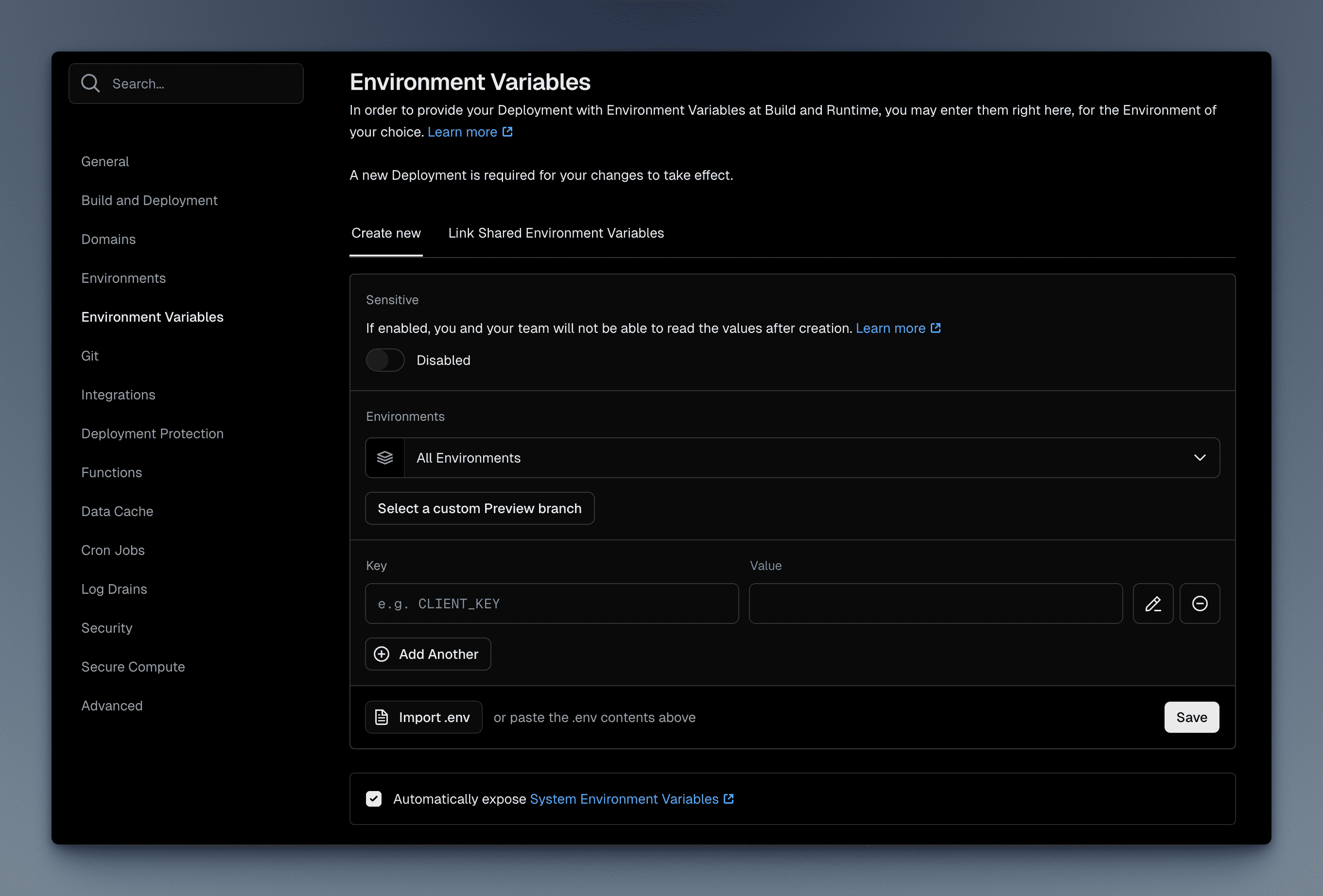 If you want to add or update environment variables after deploying the project, you can do it in the Project Settings > Environment Variables, and then redeploy the project.